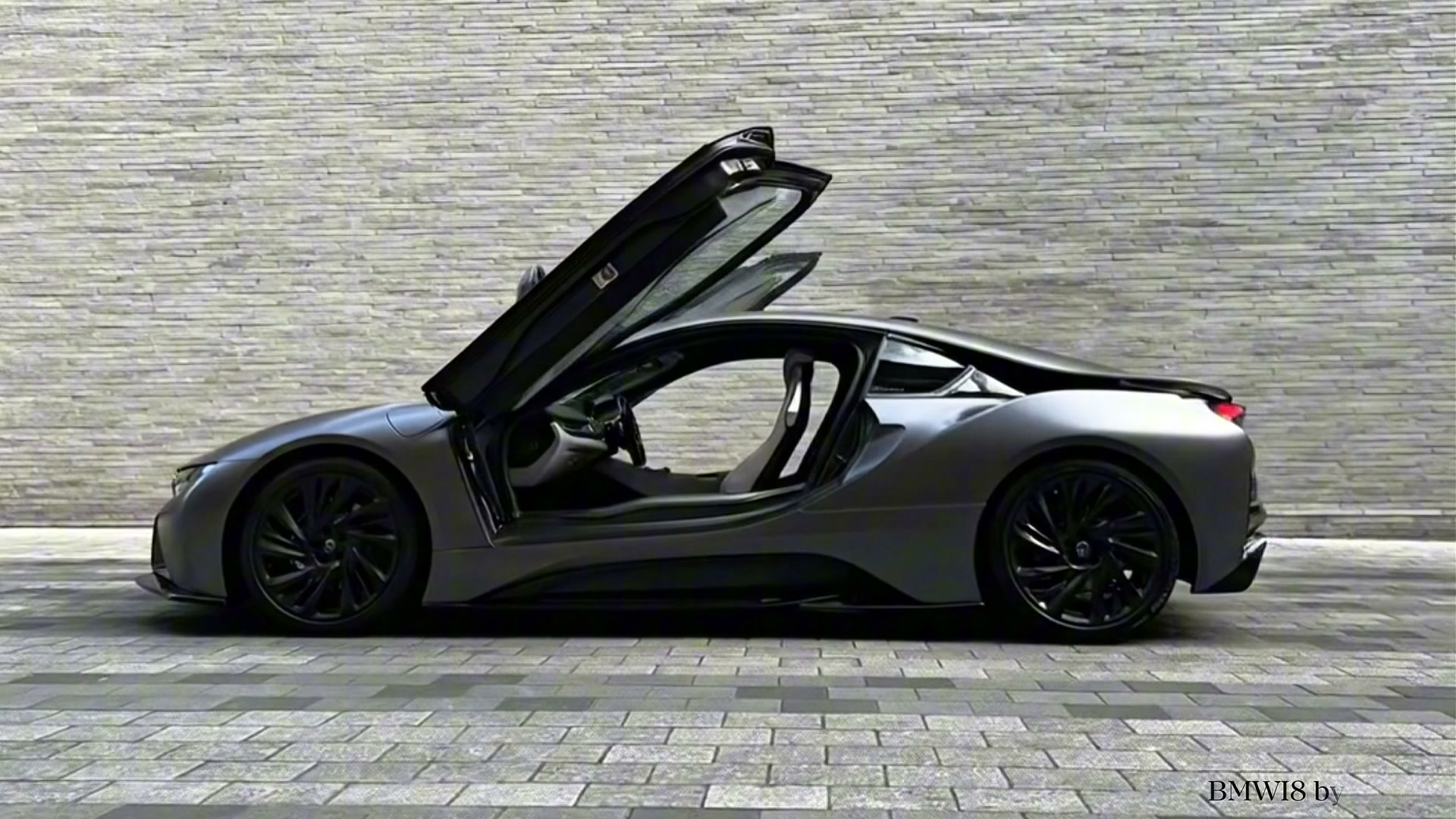 Butterfly doors. Matte grey BMW i8 with custom carbon splitter, blacked-out wheels, and fu...